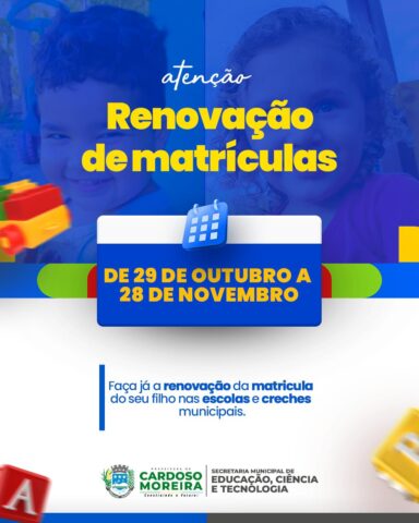 A Secretaria Municipal de Educação de Cardoso Moreira informa que o período de renovação de matrículas para o ano letivo já está aberto e segue até o dia 28 de novembro. Pais e responsáveis devem ficar atentos aos prazos para garantir a vaga de seus filhos nas creches, ensino fundamental, ensino médio e na Educação de Jovens e Adultos (EJA) da rede municipal.